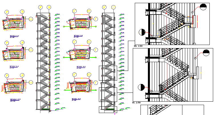 Twelve level building staircase and construction details that includes a detailed view of staircase view of floors, steps construction details, supportive pillar construction, column and beam construction details and much more of staircase details.