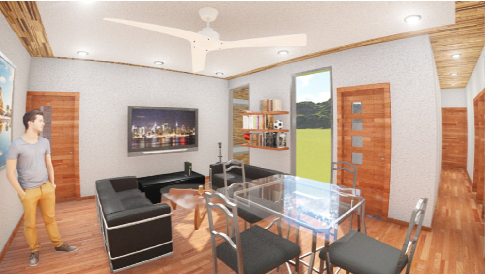 3d design of living room details that includes a detailed view of fan, door, sofa set, lights, indoor interior details and much more of living room design.
