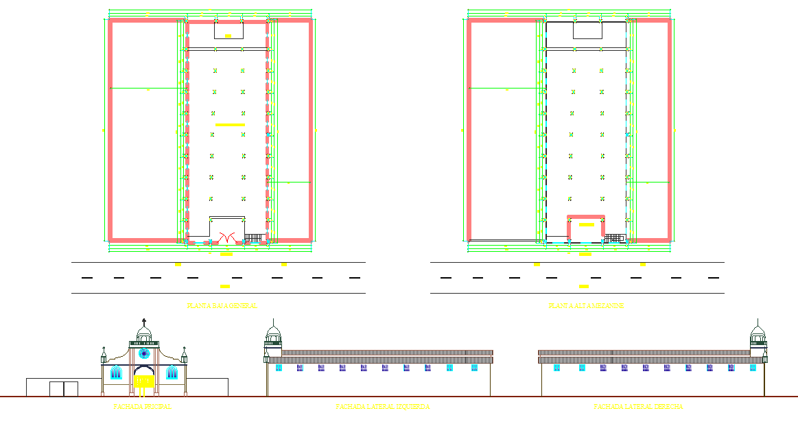 This Church Design DWG file presents a complete architectural layout featuring a 42-meter-long nave, symmetrical aisles, and a clearly defined central access point. The drawing includes two major floor levels: a general ground floor plan and a mezzanine plan, both detailing column spacing, circulation paths, and altar positioning. The façade showcases a beautifully proportioned entrance with a central dome, flanking towers, arched openings, and classical ornamentation suitable for traditional worship spaces. The wall thicknesses, structural grids, and alignment points are all precisely drafted, making it ideal for architectural analysis and conceptual development.