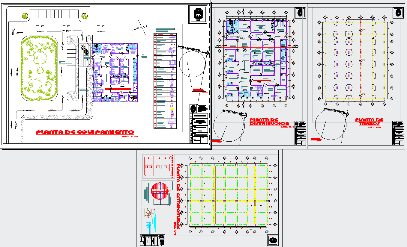 This AutoCAD DWG file presents a complete emergency hospital layout design, featuring a detailed equipment floor plan, patient distribution areas, and structural grid drawings. The primary plan includes clearly marked circulation paths, parking access, landscaped zones, and a functional building footprint organized around medical service clusters. The emergency block showcases dedicated treatment rooms, administrative offices, consultation zones, and support facilities arranged with precision to enhance workflow. The included distribution plan provides a clear view of internal divisions, showing optimized space usage for patient flow, staff movement, and equipment accessibility.