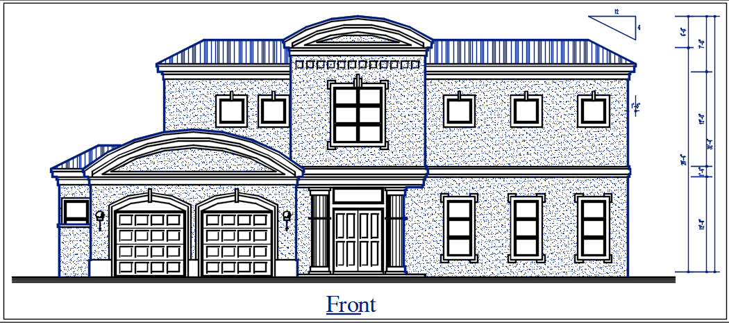 Front elevation view of bungalow dwg file, Front elevation view of bungalow with elevated height measurement, garage door, door & window elevation view