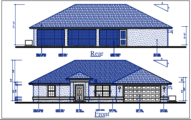 Bungalow plan Front elevation and rear elevation view of dwg file, Front elevation and rear elevation view of bungalow with elevated height measurement, garage door, door & window elevation view
