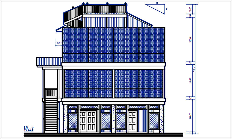 West elevation view of bungalow dwg file, West elevation view of bungalow with elevated height measurement, garage door, door & window elevation view
