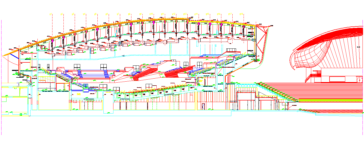 This AutoCAD DWG file of the Auditorium Rome provides a complete sectional view of one of the most iconic cultural venues in Italy. The drawing includes highly detailed architectural sections illustrating the auditorium’s curved roof structure, acoustic optimization layers, audience seating arrangements, tiered platforms, and internal circulation elements. The file also highlights major construction components such as concrete columns, beam grids, staircases, ventilation zones, backstage access points, and the relationship between underground and ground-level facilities. The sloped seating geometry and mezzanine transitions are clearly represented, helping architects analyze sightlines and acoustic distribution.