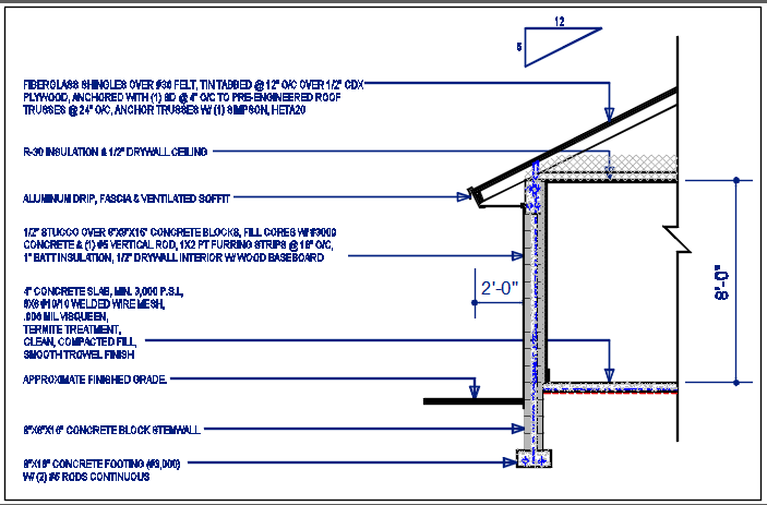 Wall section detail with foundation details and floor divided naming all of the material, with dimension details