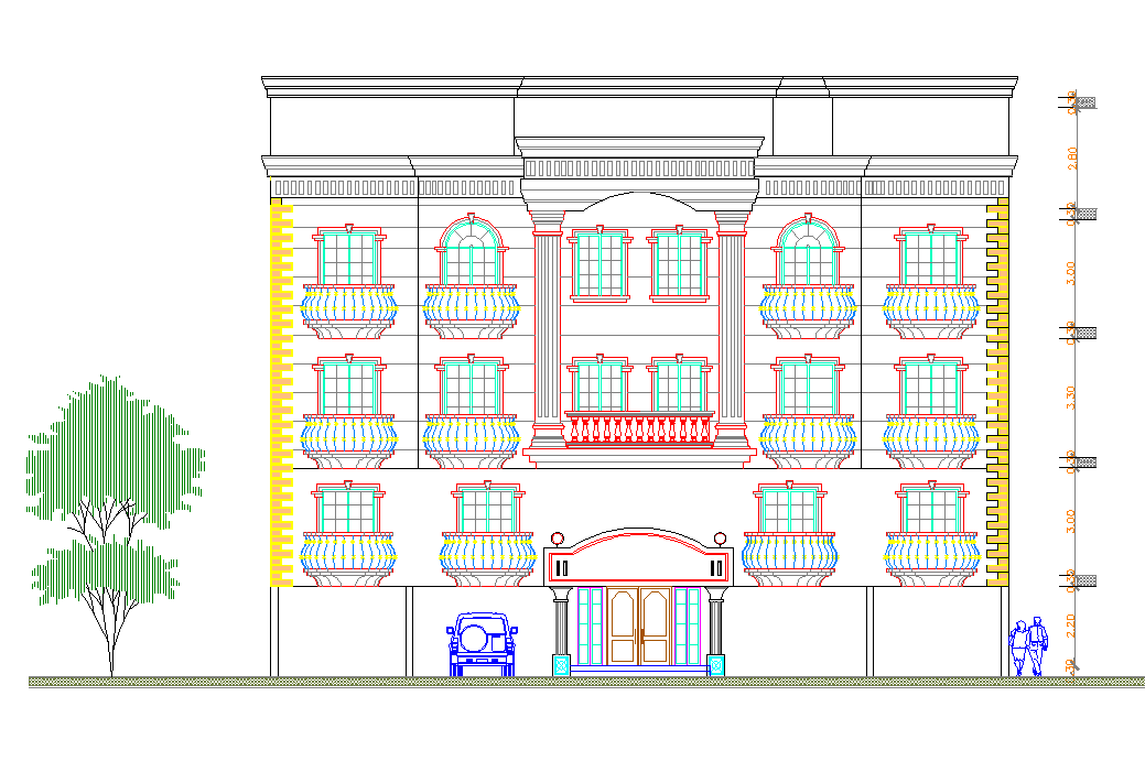 Bungalow elevation view dwg file, Bungalow elevation view with elevated height measures