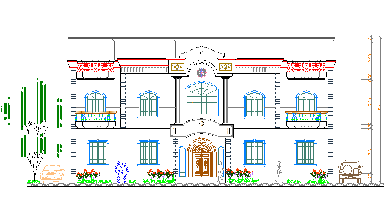 Villa elevation view dwg file, Villa elevation view with elevated height measures