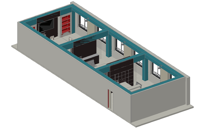 3D view of office dwg file in 3d view of office with wall and ground floor view and column and window view,door,cabin ate and office cabin view with table and chair view.