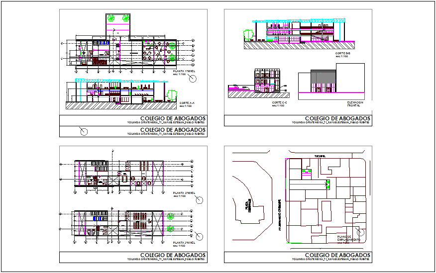 Collage plan and elevation dwg file in plan with view of main entrance,library,president office,Secretary room,auditorium,room view and view of washing area and view of wall