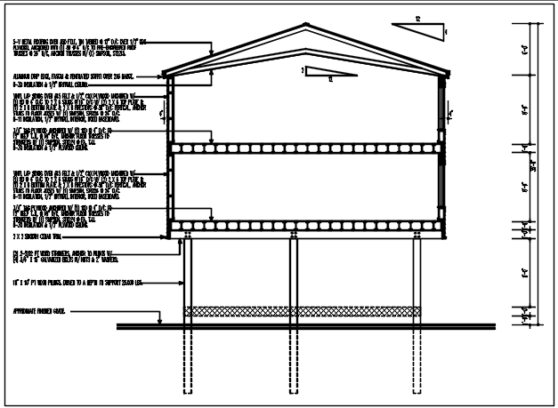 Roof elevation section detail with foundation details and floor divided naming all of the material, with dimension details