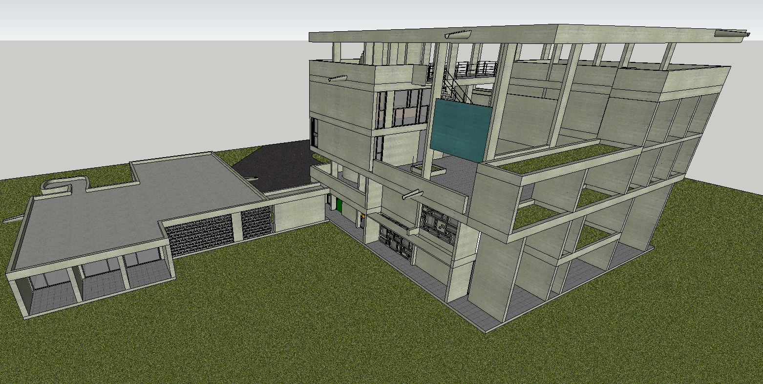 The Villa Shodhan 3D DWG Model presents a detailed multi-floor visualization of Pierre Jeanneret’s iconic modern residence, showcasing its exposed structural grid, open terrace levels, and layered volumetric form. The model clearly illustrates the stepped vertical arrangement, extended cantilever slabs, and open-to-sky cutouts across the upper floors. The ground level displays large window modules, recessed entrances, and a connected single-floor block with flat roof detailing. Staircases, internal corridors, and vertical circulation shafts are accurately modeled, giving users a clear understanding of spatial flow and inter-floor transitions. The exposed concrete structure and grid-based façade pattern reflect Jeanneret’s m