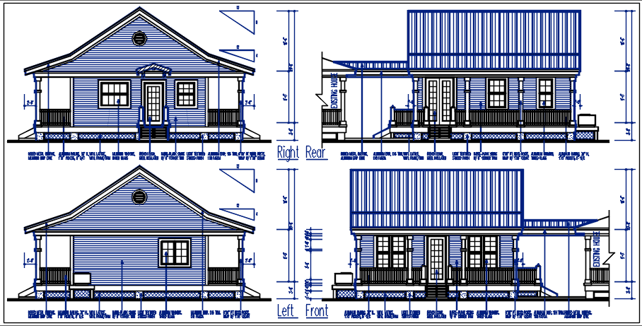 Bungalow plan elevation details dwg files, Bungalow plan elevation details with front elevation naming, dimension detail, rear elevation detail with dimension, right elevation detail with dimension detail, left elevation detail with dimension detail, etc.