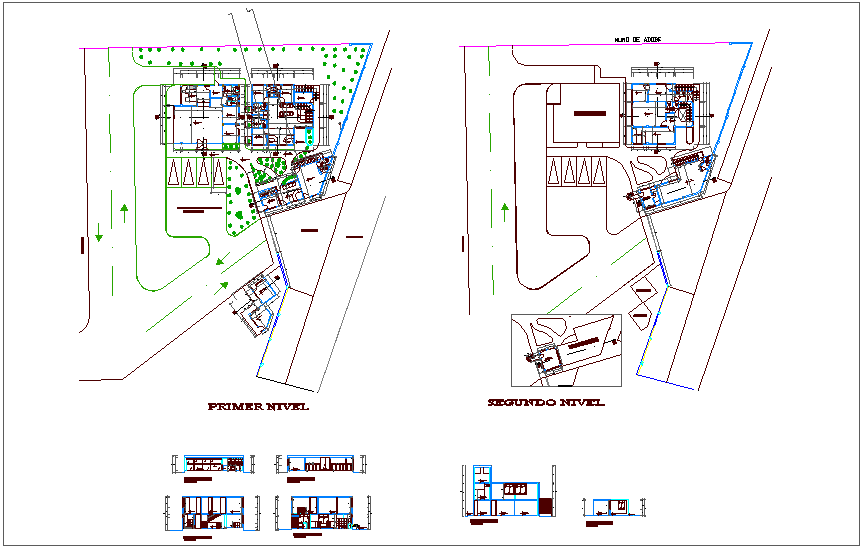First,second floor and section view of office dwg file in first floor view with tree and road view and main entrance view,office view,reception,washing area and kitchen view