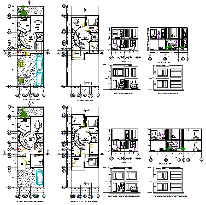 This DWG file also includes complete elevation drawings front façade, rear façade, and both side elevations showing window proportions, door placements, roof lines, and shading elements. The sectional drawings (Corte X-X and Corte Y-Y) illustrate vertical circulation, interior room heights, structural connections, and material layering. Additionally, the growth plan versions (Planta Baja de Crecimiento and Planta Alta de Crecimiento) demonstrate future expansion possibilities. This makes the file ideal for architects, engineers, and designers working on adaptable residential projects that require detailed floor layouts and structural presentation.