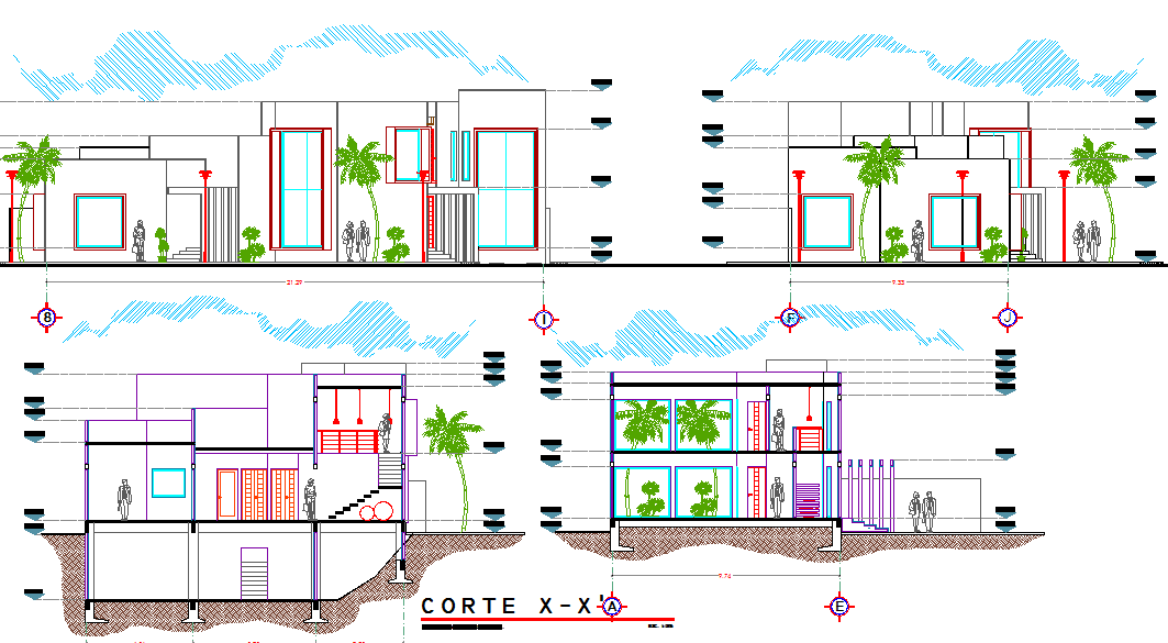 2D elevation details of a building, here there is 3d elevation of a big building design,landscaping detail , human figure detailing etc