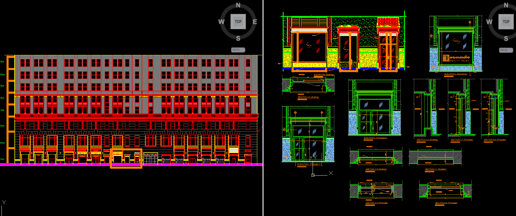Architects, civil engineers, and builders can utilize this AutoCAD DWG drawing to understand elevation proportions, floor alignments, and architectural section details. It serves as an excellent reference for urban commercial building design, façade development, and renovation projects. The file also includes section cuts highlighting wall thickness, glazing patterns, and structural framing systems, ensuring accuracy for construction planning. Download this high-quality DWG drawing today and enhance your architectural project workflow with professional-level precision and detailing.