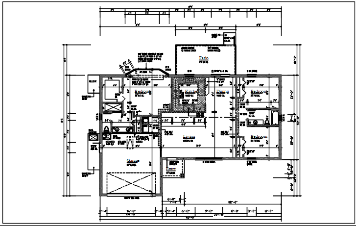 Residential house view details dwg file, Bungalow plan view details with dimension details, beam details in the bungalow, hidden line plumbing line in bungalow