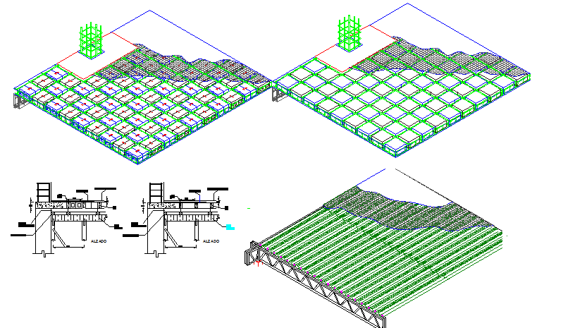 Ribbed slab construction details that includes a detailed view of landscaping, isometric view, column construction, supportive beam construction, base floor construction, material used details, cuts, joints and much more of slab construction details.