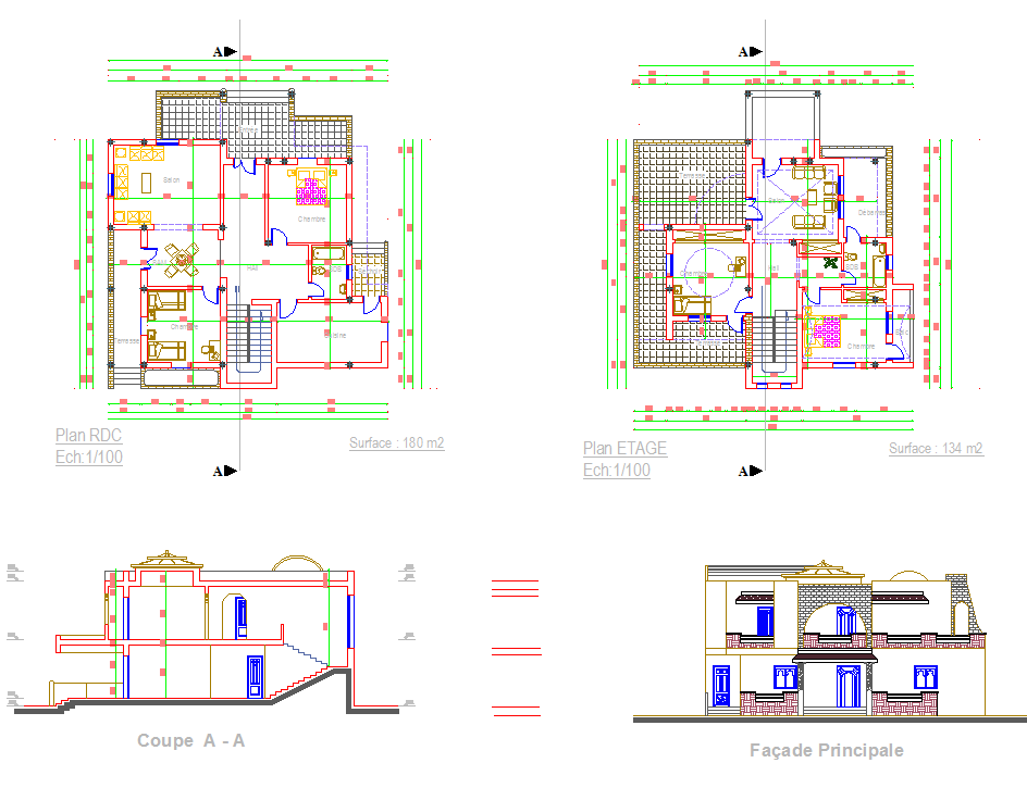 This AutoCAD DWG file features a complete two-floor house plan designed with functionality, comfort, and architectural clarity. The ground floor covers a total surface of 180 square meters and includes a spacious salon, dining area, multiple chambers, kitchen, storage zones, sanitary spaces, and a centrally located staircase for efficient vertical circulation. Wall dimensions, door placements, and façade alignment are drawn at a 1/100 scale for precise interpretation. The upper floor, measuring 134 square meters, displays additional bedrooms, a large terrace, living spaces, and a well-connected layout suitable for modern family living. Each room is carefully positioned to maximize natural ventilation and internal movement.