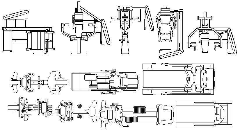 Fitness equipment blocks details that includes a detailed view of different kind of gym equipment in different sizes for multiple uses.