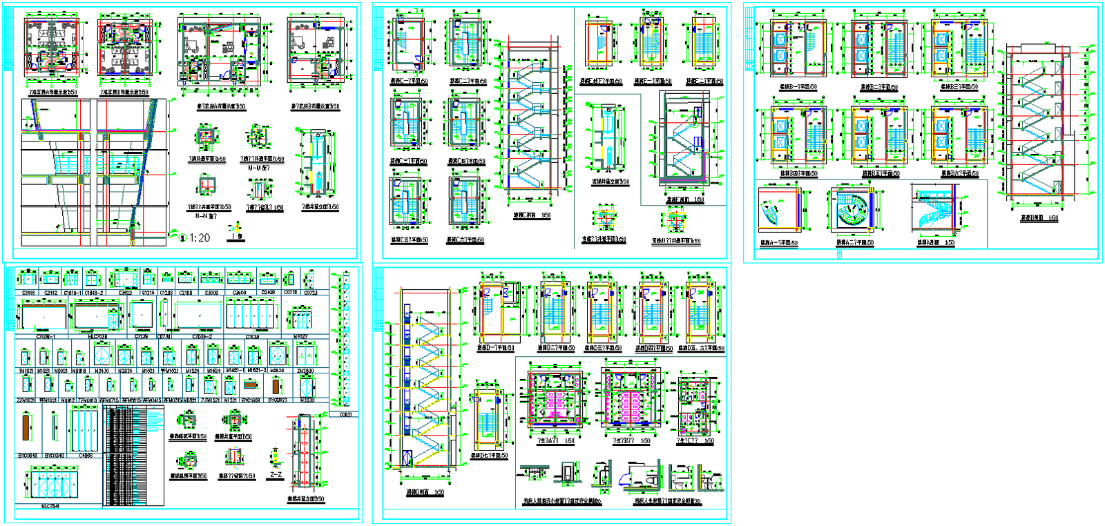 This AutoCAD DWG file presents a complete modern hostel design featuring detailed room modules, staircase configurations, structural dimensions, and circulation layouts aimed at providing comfortable and affordable living. The drawings illustrate multiple room types with clear interior arrangements, including bed placements, sanitary spaces, ventilation windows, and storage zones. Each unit is dimensioned precisely, showing wall thicknesses, door widths, and spatial distances to support efficient planning. The file also includes multiple staircase variations such as straight flights, L-shaped stairs, U-shaped configurations, spiral stairs, and multi-floor vertical circulation options, all drawn with exact measurements and reinforced details.
