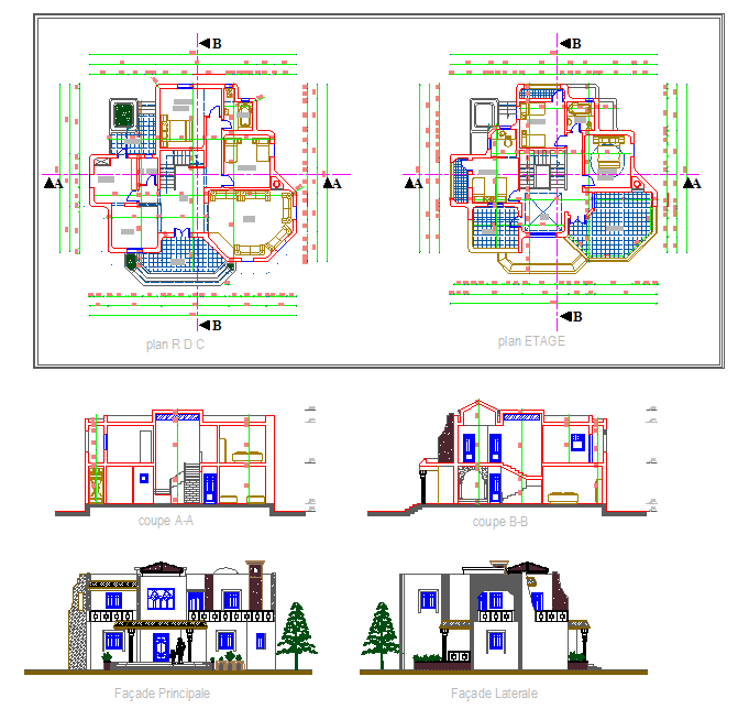 The upper floor (Étage) enhances the home’s livability with additional bedrooms, balconies, storage areas, and open lounge spaces situated around the main staircase. Detailed sections A-A and B-B offer insight into the vertical structure, including slab elevations, roof contours, stair design, and internal height distribution. The façade drawings further define the exterior appearance, highlighting window proportions, textured surfaces, balcony outlines, and architectural ornamentation that complement the bungalow’s overall character. Suitable for architects, civil engineers, and residential builders, this DWG file delivers a well-drafted and complete set of drawings that support design development, modification, and on-site implementation.