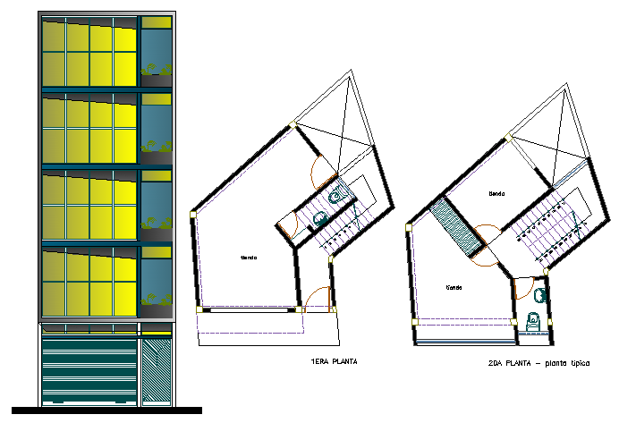 Multi-flooring office building elevation with sanitary installation of two floors dwg file.