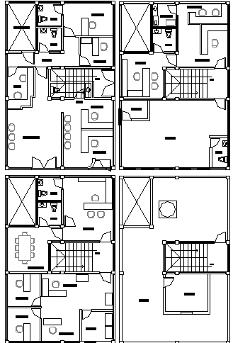 Four flooring office building floor plan layout plan that includes a detailed view of main entry door, reception area, inquiry desk, waiting room, employee office, head offices, conference room, meeting room, admin area, kitchen cafeteria with dining area, toilets and much more of office building floor plan details.