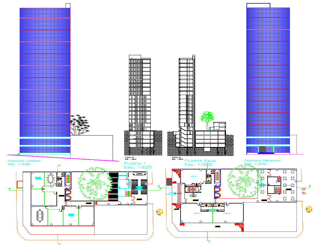 High-rise building plan detail dwg file, High-rise building plan detail and design plan layout with specification detail, corporate office building view, elevation and section view detail, exterior elevation view etc