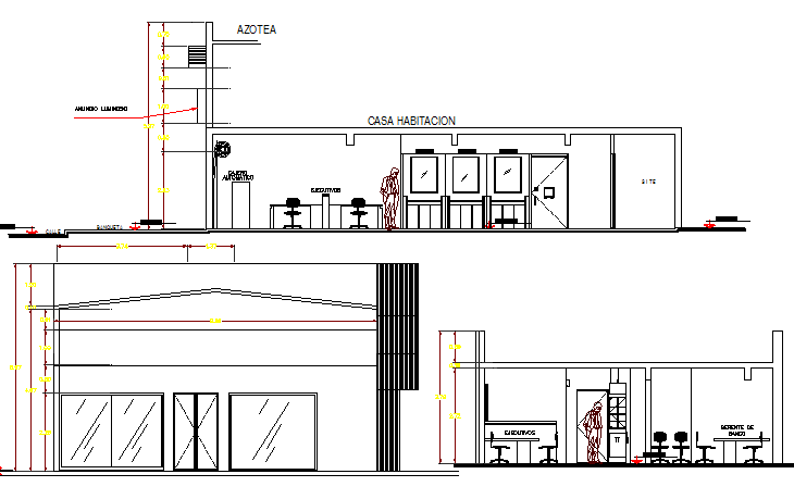 City bank elevation and section details that includes a detailed view of main elevation, front section, back section, cash counter, floor view, staircase view, doors and windows view, wall design, manager cabin view, office and much more of bank details.