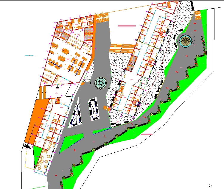Hybrid building-tumbesecuador layout plan dwg file, top view layout plan of a building, contains landscaping detail, furniture detail