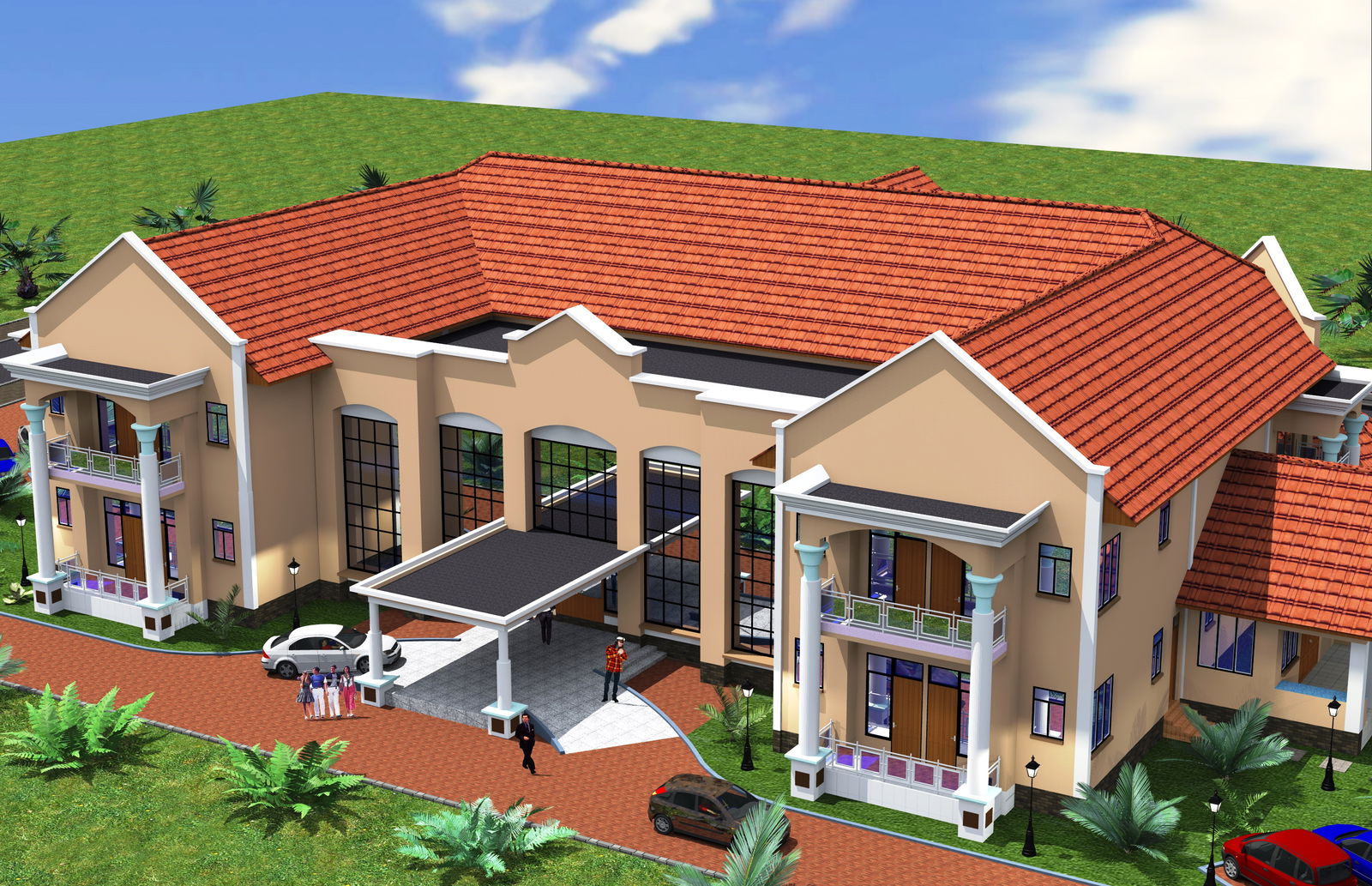 Fabulous hotel with club, function hall, restrooms and restaurant. This is a complete design project with all construction drawings, 3d images, and landscaping design.