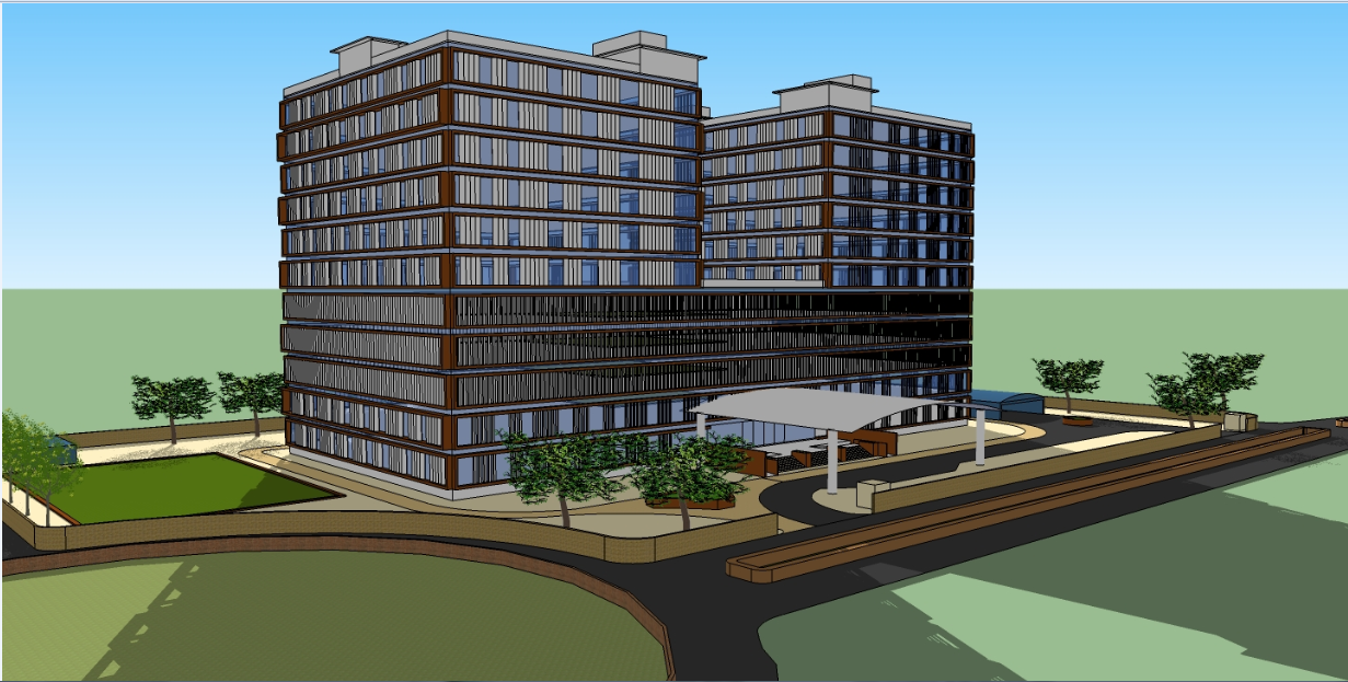High rise building design elevation dwg file, 3D elevation details of a building, here there is 3d elevation of a big building design,landscaping detail , human figure detailing etc
