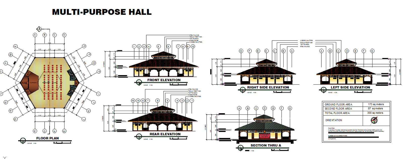 This modern senior living hall AutoCAD design provides a clear, well-structured layout suitable for retirement homes, assisted living facilities, and community-focused senior spaces. The plan features a total built-up area of 300 sq meters, divided into a 173 sq meter ground floor and an 87 sq meter upper floor. The octagonal floor plan displays organized seating arrangements, circulation paths, and surrounding structural bays labeled from A to G. Detailed elevation views, including front, rear, left, and right sides, highlight key architectural elements such as steel railings, wooden shutters, tiled roofing, and extended verandah shading. Each elevation is dimensioned precisely to support accurate execution and presentation.
