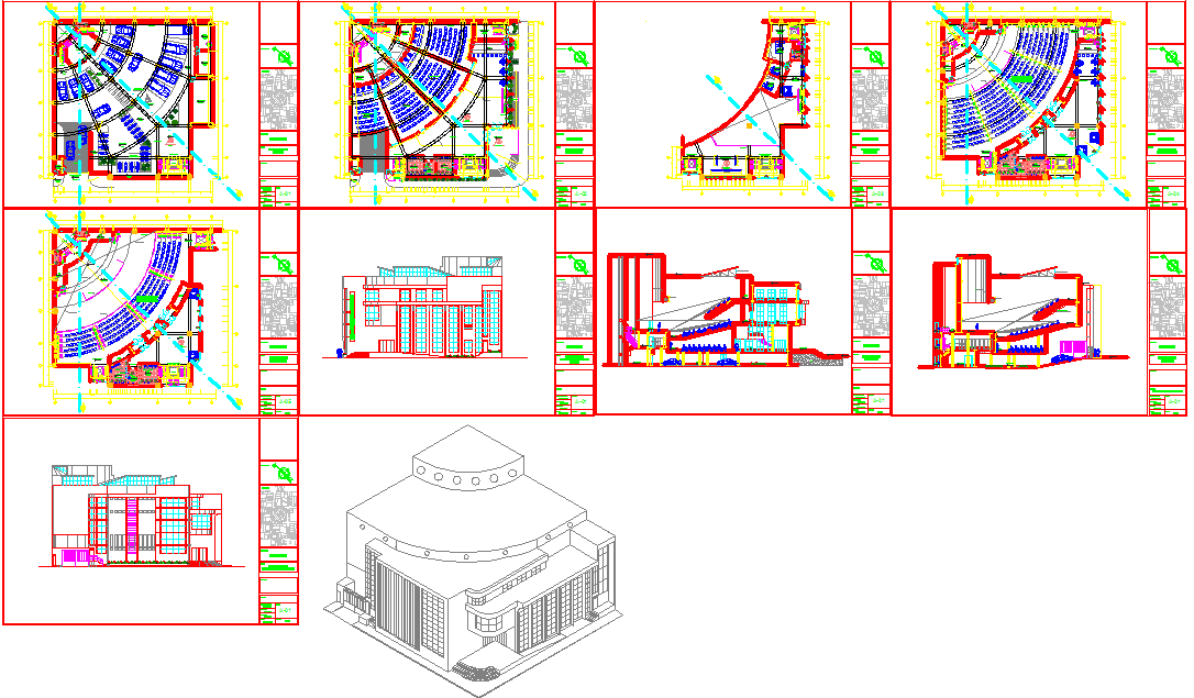 Additionally, the design set features multiple elevation drawings and sectional views that illustrate wall heights, balcony projections, lighting positions, acoustic panel zones, and vertical circulation paths. These sections provide insight into the internal volumetric arrangement supporting optimized sound travel and structural stability. The file further showcases a 3D exterior representation that helps visualize the front facade, roof layers, column placement, and overall architectural massing. This auditorium plan package is ideal for architects, engineers, and designers seeking complete reference drawings for large public gathering spaces, performance halls, or educational institution auditoriums.