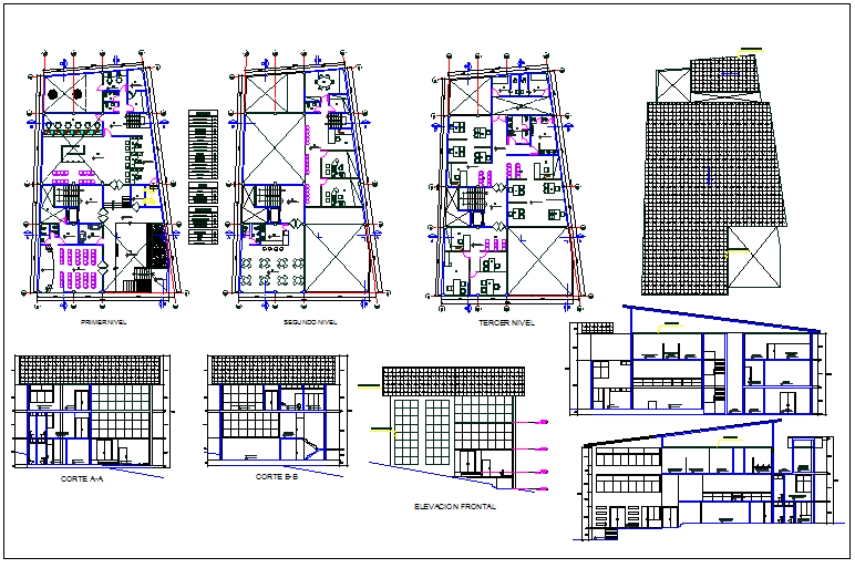 Office building plan detail dwg file, Office building plan detail and design plan layout view detail of each floor with dimensions detail, specification detail, elevation and section view detail etc