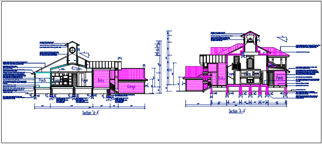 Section elevation view of house detail dwg file, Section elevation view of house detail with dimensions detail, living room, porch, foyer, kitchen etc