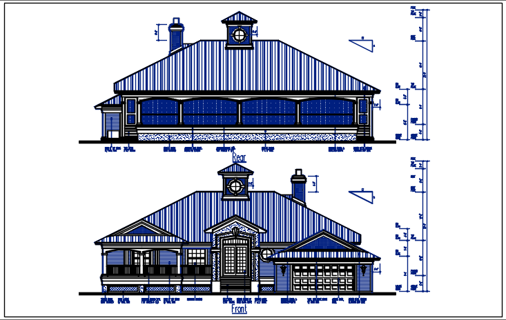 Bungalow elevation details dwg files, Bungalow elevation and side elevation view plan, reeling elevation view, grid line elevation and dimension detail, naming details of the elevation