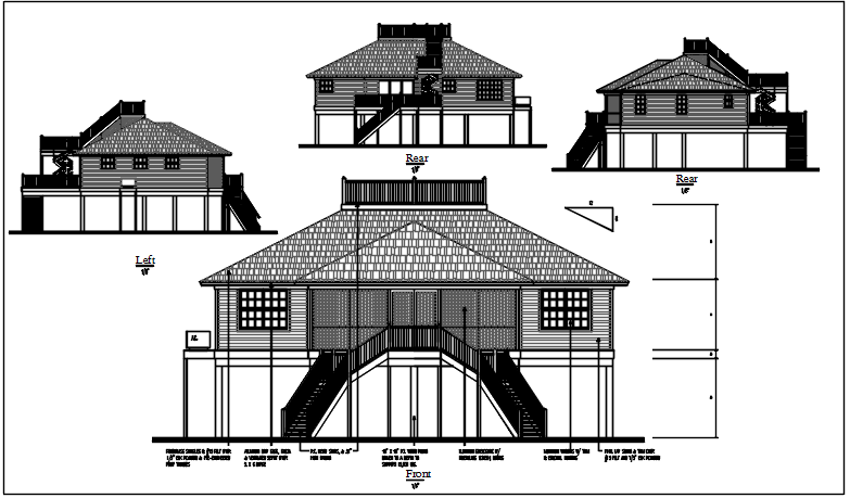 Bungalow plan view details dwg files, Bungalow plan view details, elevation and side elevation vie details, front bungalow elevation & side elevation, chimney elevation of top to bottom, door, window, reeling, balcony, and elevation dimension with detail.