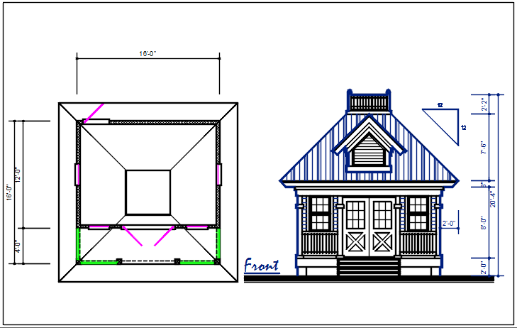 Bungalow plan and elevation details dwg files, Bungalow plan and elevation with front elevation view plan, reeling elevation view, grid line elevation and dimension detail, naming details of the elevation