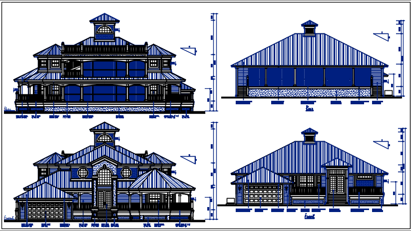 Bungalow elevation details dwg files, Bungalow front elevation and rear elevation view plan, reeling elevation view, grid line elevation and dimension detail, naming details of the elevation