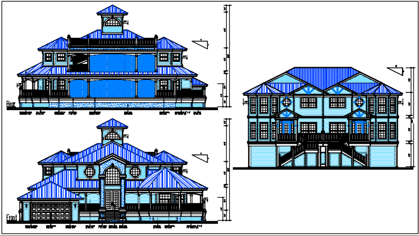 Bungalow plan view details dwg files, Bungalow plan view details, elevation and side elevation vie details, front bungalow elevation & side elevation, chimney elevation of top to bottom, door, window, reeling, balcony, and elevation dimension with detail.