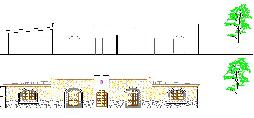 Full elevation details of corporate office that includes a detailed view of front elevation, back elevation, doors and windows view, wall design, staircase view, tree view, roof view, main entry gate and much more of office elevation.