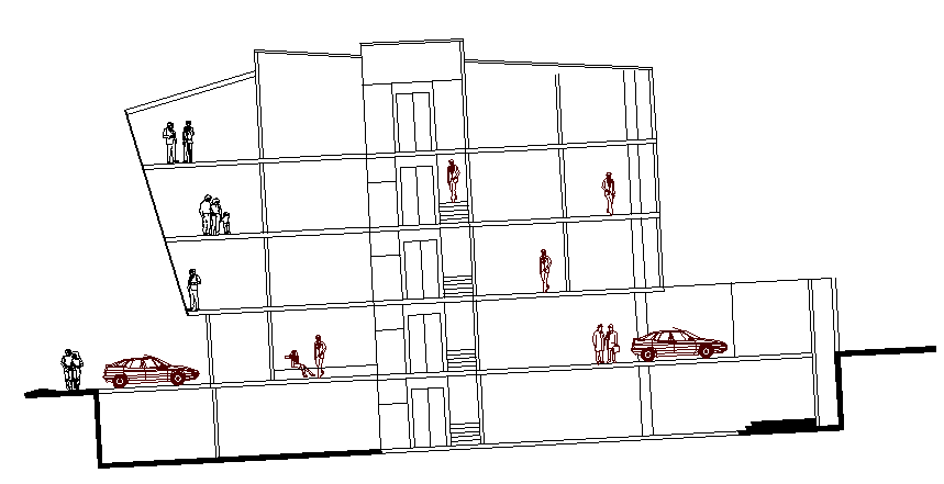 Sectional view of ministry publish office building that includes a detailed view of flooring view, car parking view, human blocks, doors and windows view, staircase view, terrace view and much more of office building section.