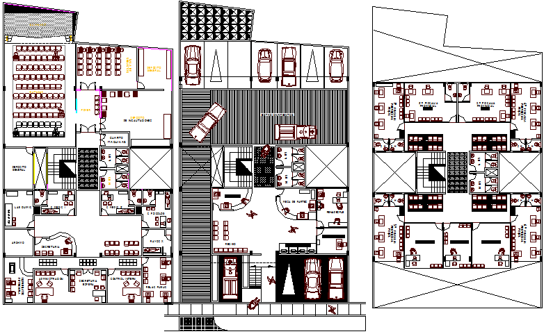 Ground, first & second floor plan details of ministry publish office building dwg file