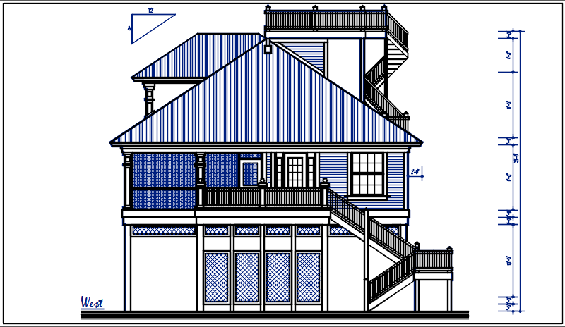West elevation detail dwg file, House plan elevation detail with naming door, window, large door, reeling and all dimension floor detail of the dimension details, etc.