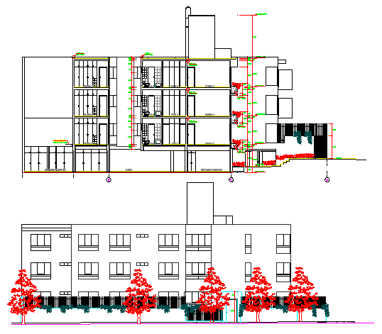 Front elevation and front sectional view of residential apartment building that includes a detailed view of tree view, doors and windows view, floor view, wall design, plant view, staircase, balcony, bedroom, toilets and much more of residential building details.