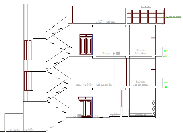 Four flooring administration building section details that includes a detailed view of front elevation, doors and windows view, flooring view, staircase view, wall design, terrace view, balcony and much more of building section details.