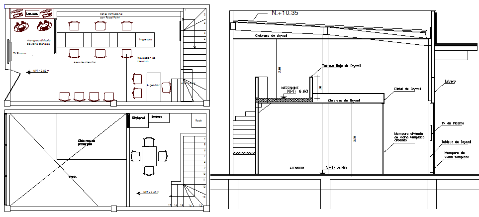 Office store sectional and structure details that includes a detailed view of roof view, wall design, measurements, cuts, joints, reception area, waiting area, general hall, offices, indoor staircase view and much more of office details.