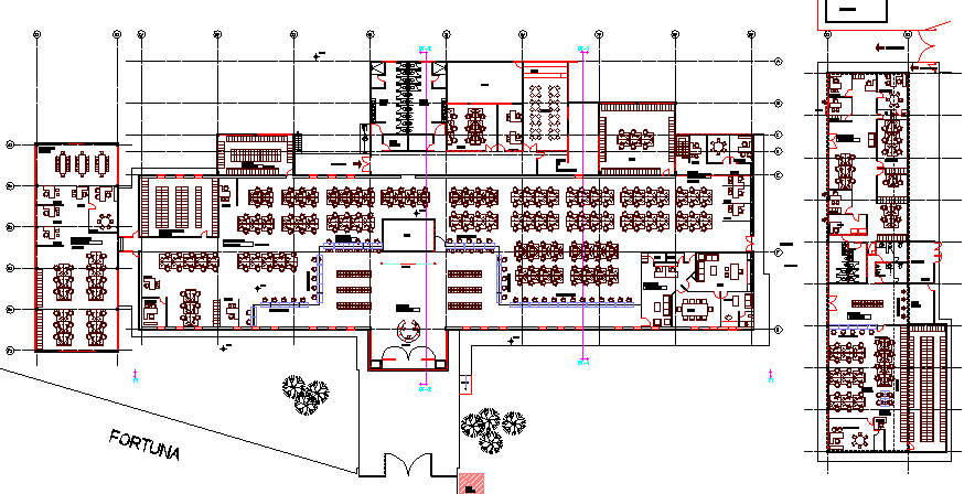 Corporate office architecture layout plan details that includes a detailed view of main entry door, reception area, waiting area, sitting area, general hall, auditorium hall, employee office, head offices, meeting room, conference room, admin office, control room, kitchen, cafeteria, toilets for male and female, cleaning room and much more of office architecture layout plan.